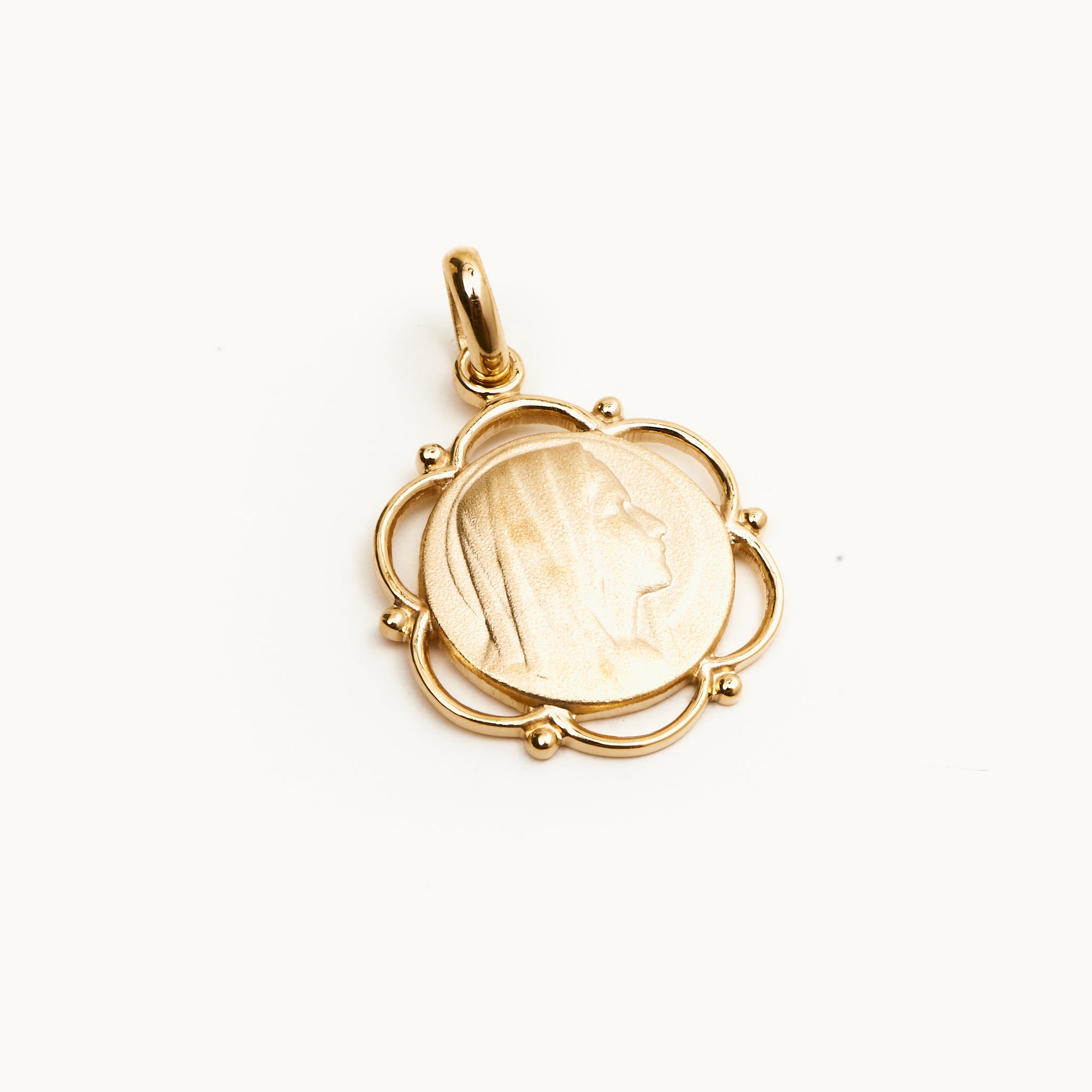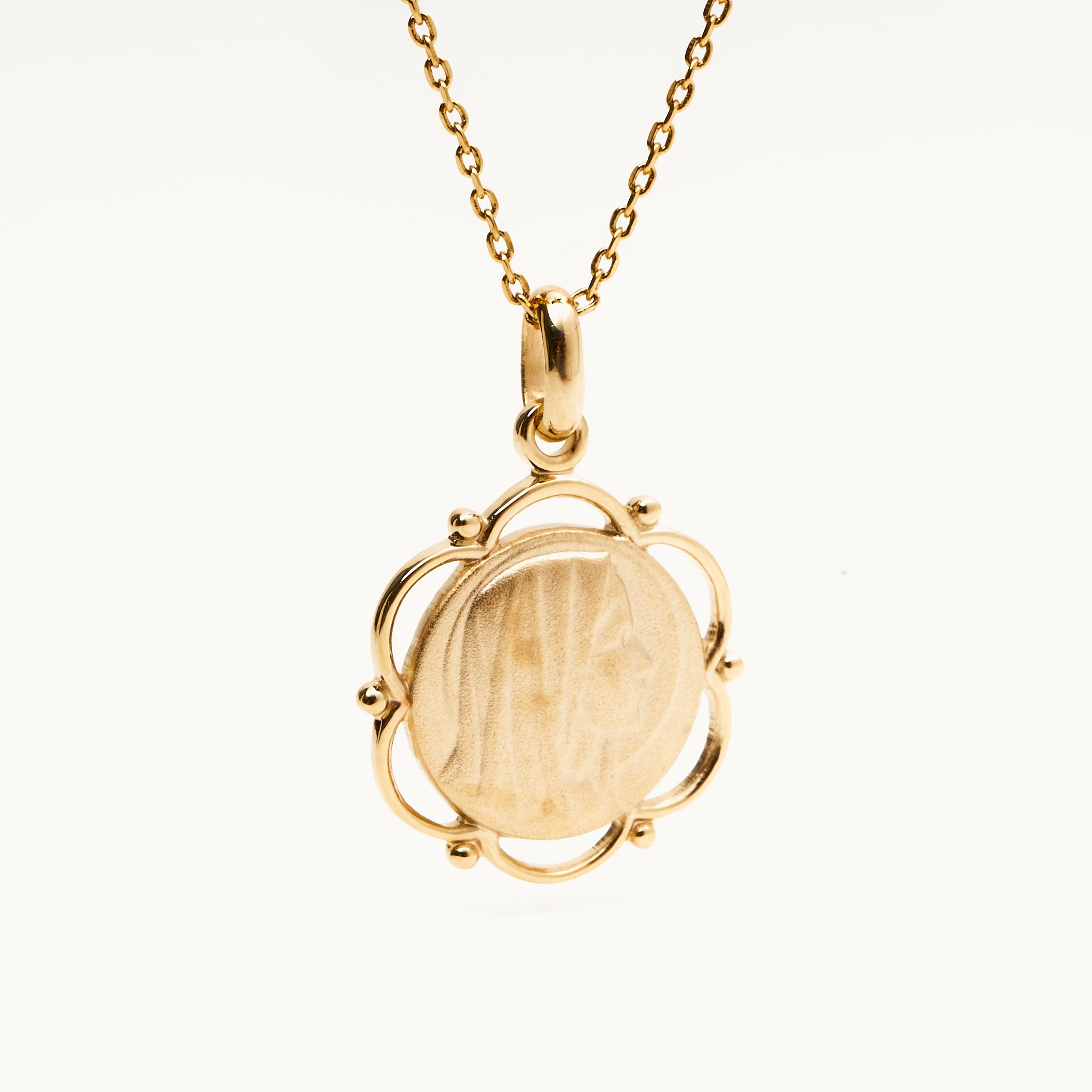 Medalla enchapada en oro 18K de 3 micrones con relieve de la virgen.- Diámetro del dije: 2 cm