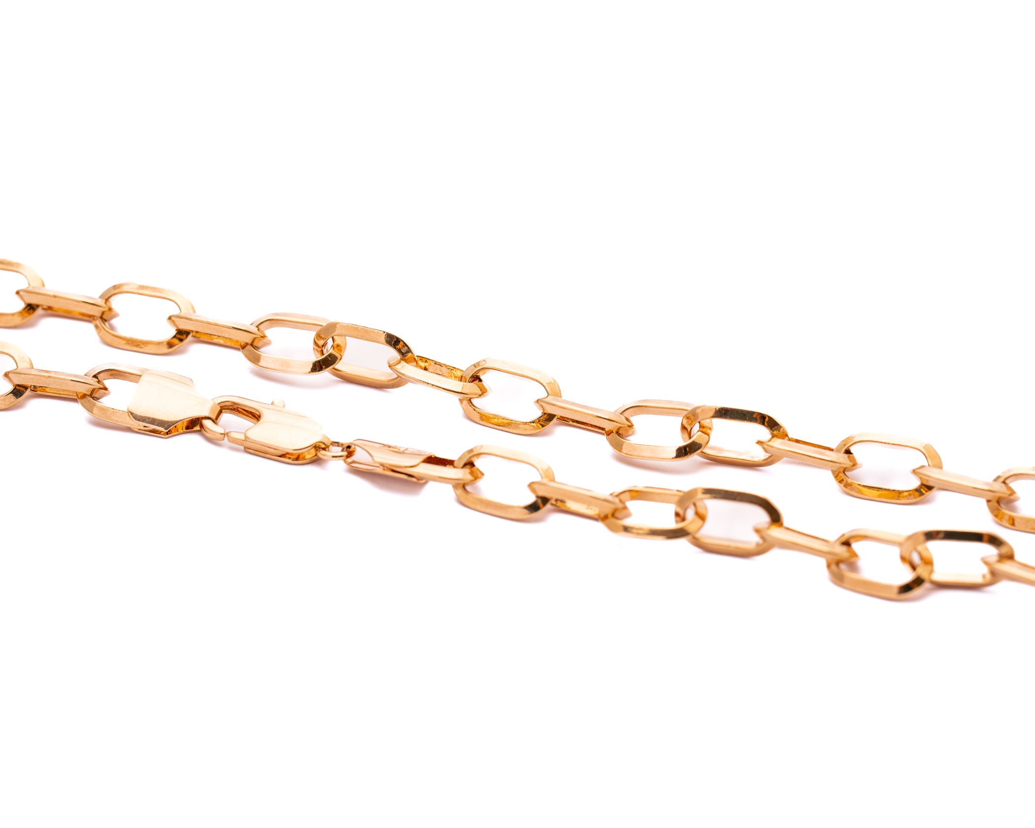 Esta cadena presenta eslabones grandes, semi rectangulares y espaciados, aportando un estilo moderno y sofisticado. Su doble gancho no solo suma personalidad, sino que además resulta práctico para agregar, cambiar o combinar dijes según tu estilo.